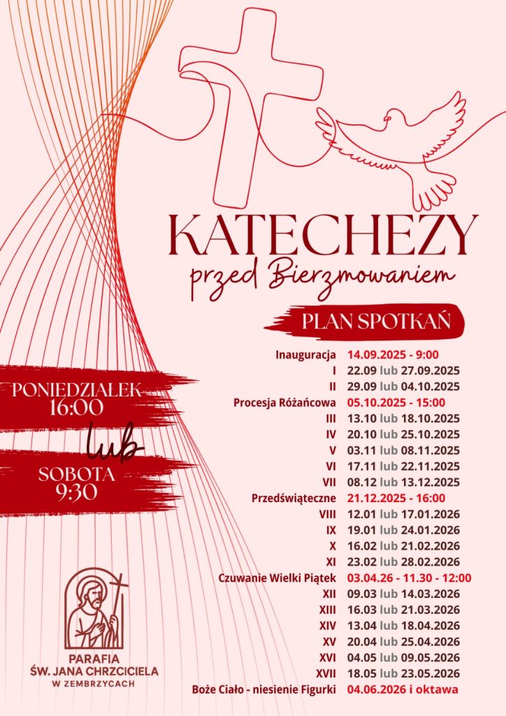 W środę, 28 maja 2025 r. rozpoczęcie przygotowania do bierzmowania dla młodzieży z klas siódmych z Zembrzyc i Marcówki. Msza św. o 18.00 dla rodziców i młodzieży; po niej spotkanie organizacyjne z wypełnieniem i złożeniem deklaracji Rodzica o wejściu dziecka na drogę przygotowania.